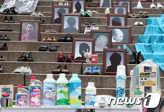 31일 오전 '전국동시다발 가습기살균제 참사' 12주기 캠페인 및 기자회견이 열린 서울역 앞에 가습기살균제 피해자들의 신발과 영정 등 유품이 놓여 있다. 2023.8.3…