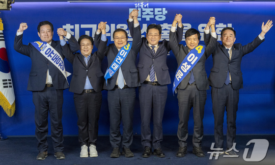 23일 서울 여의도 더불어민주당 중앙당사에서 열린 최고위원 선출을 위한 1차 합동연설회에서 유동철왼쭉부터, 문정복, 이건태, 이성윤, 강득구 최고위원 …