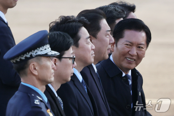정청래 더불어민주당 대표가 26일 오전 경기도 성남시 서울공항에서 아프리카·중동 4개국 순방 일정을 마무리한 이재명 대통령 귀국 환영을 위해 대기하고 있다. 2025.1…