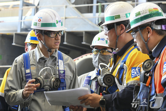 정기선 HD현대 회장이 지난 9월 전남 영암군 HD현대삼호 조선소를 찾아 작업 현장을 살피고, 안전 시설물과 설비를 점검한 모습HD현대 제공.H…