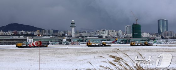 8일 오전 강한 눈폭풍으로 활주로 운영이 중단된 제주국제공항에서 제설차들이 분주히 오가고 있다. 2026.2.8 뉴스1 오미란 기자제주 기상악화로 제…