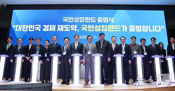 이억원 금융위원장, 박현주 미래에셋 회장, 서정진 셀트리온그룹 회장 등 참석자들이 11일 서울 여의도 산업은행 본점에서 열린 국민성장펀드 출범식에서 기념촬영을 하고 있다…
