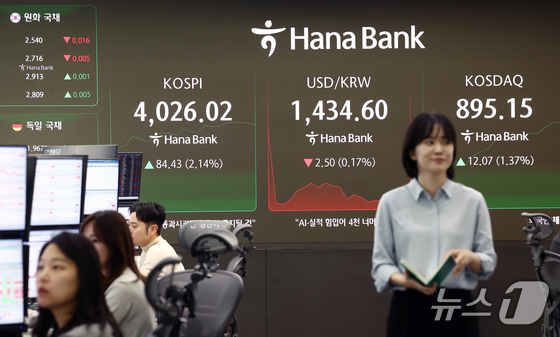 코스피 지수가 장중 포인트를 돌파한 일 오전 서울 중구 하나은행 본점 딜링룸에서 딜러들이 업무를 보고 있다. 이날 코스피는 전 거래일.…