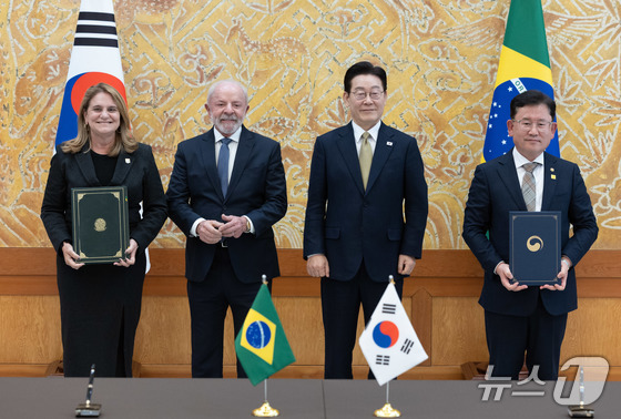 이승돈 농촌진흥청장과 실비아 마스루하 브라질 농업연구청장이 23일 청와대에서 이재명 대통령과 브라질 루이스 이나시우 룰라 다 시우바 대통령이 임석한 가운데 농업기술협력 …