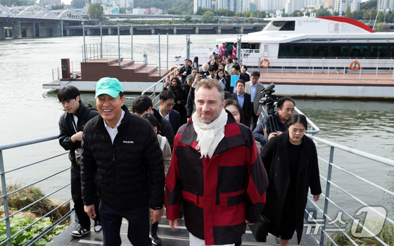 오세훈 서울시장과 토마스헤더윅 건축가가 일 서울 용산구 노들섬에서 열린 '노들 글로벌 예술섬' 착공식에 한강버스를 타고 참석하고 있다. ../뉴스 …