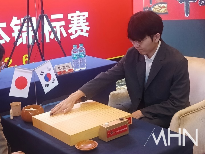 신진서 9단이 첫 수를 두고 있다.(사진 중국 선전에서 MHN 엄민용 선임기자) (MHN 엄민용 선임기자) 신진서 9단이 농심신라면배 우승을 향한 첫 고비를 무사히 넘어섰다. 4일