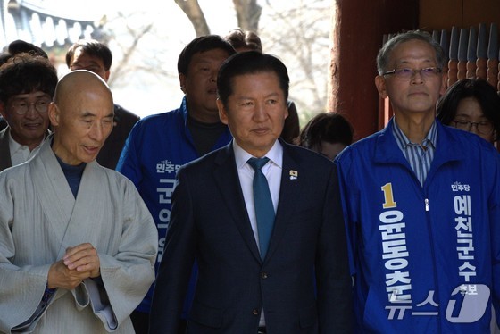 정청래 더불어민주당 대표가 27일 경북 대형 산불로 피해입은 의성 고운사에 방문했다. 이날 정 대표는 경북 북부 시장, 군수 예비후보들과 인사를 나누고 훼손된 사찰을 돌…