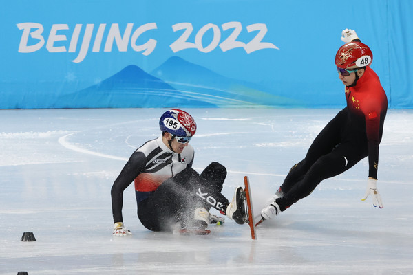 7일 열린 2022베이징동계올림픽 쇼트트랙 남자 1,000m 준준결승 경기 도중 넘어진 뒤 중국 우다징의 스케이트날에 손가락 부상을 입은 박장혁 사진=연합뉴스 (MHN 이현아 기자