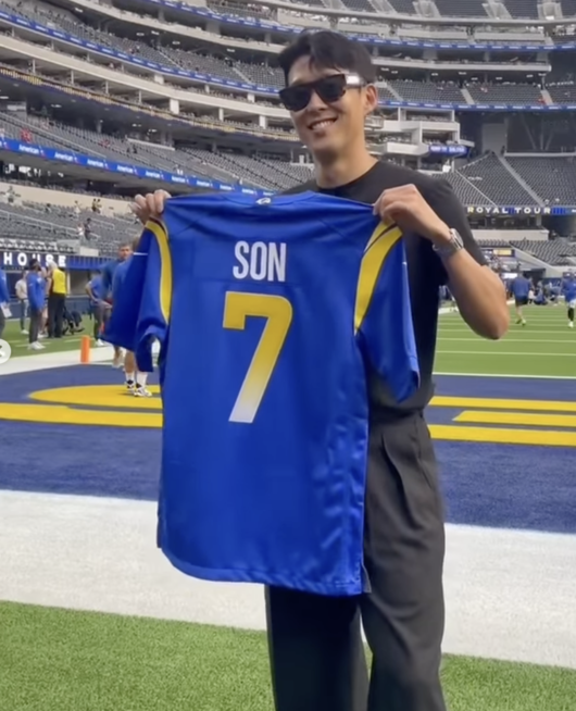 '나의 LA 라이프 어때?' 손흥민, 美 스포츠 '소풍' 일정 포착! NFL LA 램스 방문→7번 들고 찰칵