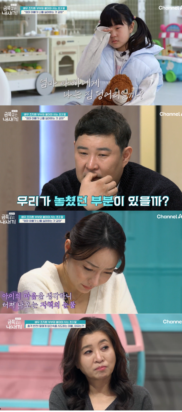 (MHN 김소영 기자) 금쪽이의 진솔한 마음을 들은 배우 조지환 부부가 눈물을 쏟으며 반성했다. 23일 채널A '요즘 육아 금쪽같은 내 새끼'에서는 '배우 조지환 부부와 꼭 붙어있