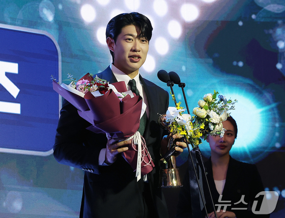 24일 오후 서울 송파구 잠실 롯데월드 호텔에서 열린 프로야구 '2025 신한 SOL 뱅크 KBO리그' 시상식에서 3루수 부문 수비상을 수상한 키움 송성문이 수상 소감을…