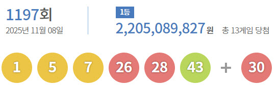 [속보]로또 1197회 당첨번호 '1·5·7·26·28·43'…보너스 '30'