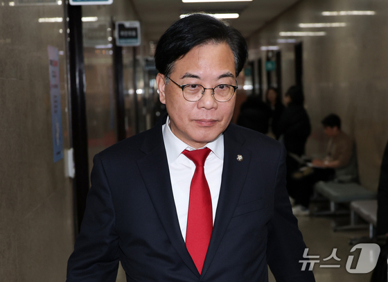 송언석 국민의힘 원내대표가 19일 윤석열 전 대통령 내란 혐의 1심 선고가 진행되는 가운데 서울 여의도 국회 본관 국민의힘 원내대표실로 들어가고 있다. 공동취재…
