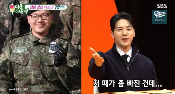 '미우새' 방송 캡처멜로망스 김민석이 인생 최대 몸무게가 나갔던 군대 시절 모습을 공개해 눈길을 끌었다.8일 오후 방송된 SBS '미운 우리 새끼'에는 선물 같은…