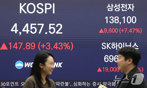 지난 5일 오후 서울 중구 우리은행 본점 딜링룸 전광판에 종가가 표시되고 있다. 이날 코스피는 전 거래일 대비 147.89포인트p3.43%…
