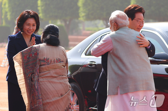 이재명 대통령과 김혜경 여사가 20일 뉴델리 대통령궁 광장에서 열린 공식환영식에서 드라우파디 무르무 인도 대통령, 나렌드라 모디 인도 총리오른쪽와 인사…