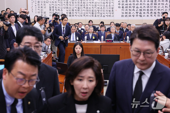 나경원 의원을 비롯한 국민의힘 법사위원들이 일 서울 여의도 국회에서 열린 법제사법위원회의 대법원 등에 대한 국정감사에서 추미애 위원장에게 항의하는 가운데 조희대 대법…