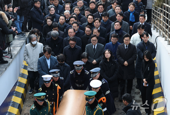 우원식 국회의장과 김민석 국무총리를 비롯한 의원들이 27일 오전 서울 종로구 서울대병원 장례식장에 도착한 고 이해찬 전 국무총리의 운구 행렬을 뒤따르고 있다. 베트남 출…