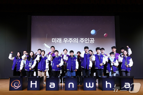 지난 10일 대전 KAIST에서 열린 '우주의 조약돌' 4기 수료식에서 KAIST 항공우주공학과 교수진과 멘토, 수료생들이 파이팅을 외치고 있다.한화 제공…