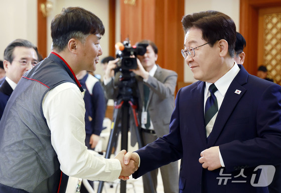 이재명 대통령과 양경수 민주노총 위원장이 10일 청와대에서 열린 전국민주노동조합총연맹 초청 간담회에서 악수하고 있다. 2026.4.10 뉴스1 이재명 기자…