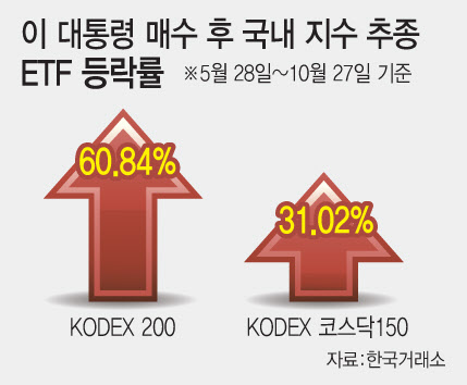 [이데일리 이용성 기자] 코스피가 4000선을 돌파하면서 이재명 대통령이 보유한 상장지수펀드(ETF)의 수익률도 급등한 것으로 파악됐다. (그래픽=이데일리 문승용 기자) 27일 한