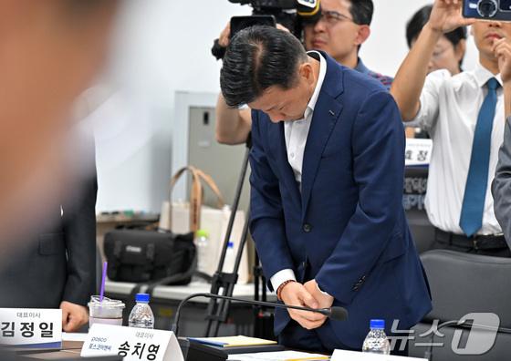 송치영 포스코이앤씨 대표가 14일 오후 서울 중구 직업능력평가원에서 열린 중대재해 근절을 위한 20대 건설사 CEO 간담회에서 산업재해로 사망한 건설노동자들에 대한 묵념…