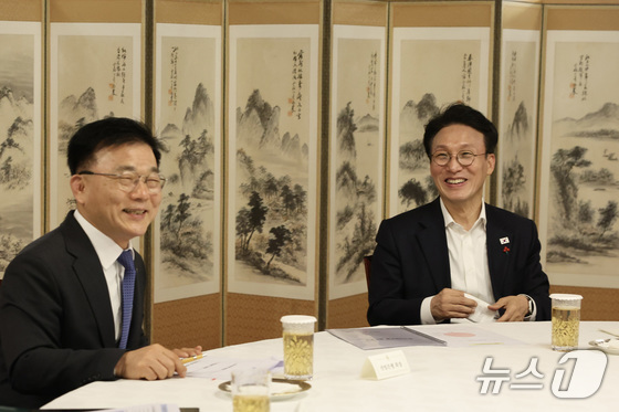 김민석 국무총리가 20일 서울 종로구 삼청동 총리공관에서 박상진 산업은행 회장과 경제현안 관련 간담회를 갖고 있다. 총리실 제공. 재판매 및 DB 금지…