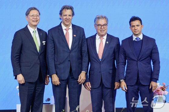 페르난두 아다지 브라질 재무장관이 23일 오후 서울 중구 롯데호텔에서 열린 한-브라질 비지니스 포럼에 참석해 기조연설을 마친 뒤 기념 촬영하고 있다. 왼쪽부터 김창범 한…