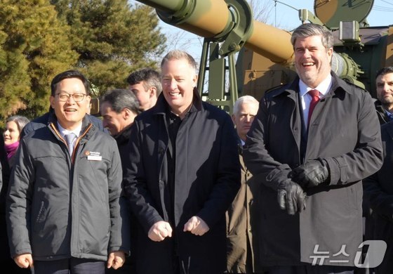 3일 한화에어로스페이스 창원사업장을 방문한 스티븐 퓨어 캐나다 국방조달 특임장관가운데과 필립 라포르튠 주한 캐나다 대사오른쪽, 손재일…