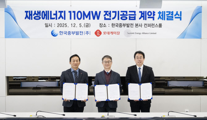 [이데일리 최훈길 기자] 한국중부발전이 재생에너지 공급에 나섰다. 중부발전은 5일 충남 보령 본사에서 롯데케미칼, 써밋에너지얼라이언스와 ‘110MW 규모 재생에너지 전력공급 계약’