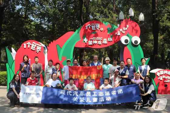 2025년 6월 중국 어린이날을 맞아 중국 북경에 위치한 중국아동센터에서 현대차 임직원들과 뇌성마비 어린이들이 예술전을 관람한 후 기념사진을 촬영하는 모습.현대…