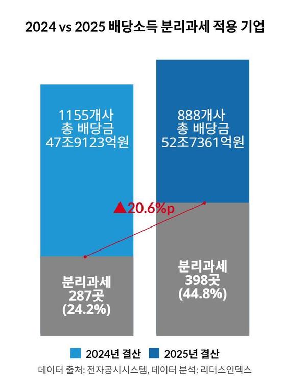 자료제공 = 리더스인덱스올해 배당을 발표한 기업 중 44.8%가 분리과세 적용 대상에 해당한 것으로 나타났다. 분리과세 적용 비율이 전년 대비 …