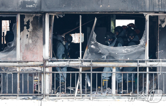 24일 오전 서울 강남구 은마아파트에서 경찰, 소방 관계자들이 화재 원인 조사를 위해 합동 감식을 하고 있다. 소방당국에 따르면 이날 오전 6시 18분쯤 발생한 화재로 …