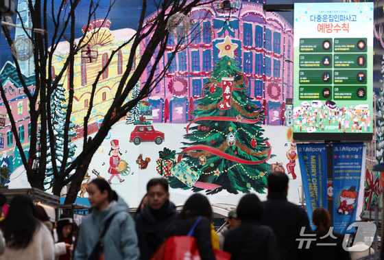 크리스마스 이브인 24일 오후 서울 중구 명동거리에 설치된 전광판에 다중운집인파사고 예방수칙 안내가 나오고 있다. 2025.12.24/뉴스1 News1 김민…