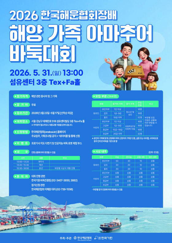 2026 한국해운협회장배, 해양가족 아마추어 바둑대회 포스터. 해운협회 제공한국해운협회는 5월 31일 오후 1시 '바다의날'을 기념하고 해운 관…