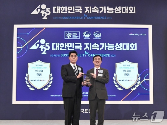 2025 대한민국 지속가능성대회에서 정광현 한샘 경영지원본부장왼쪽과 문동민 한국표준협회장이 기념 사진을 촬영하고 있다. 한샘 제공. 재판매 및…