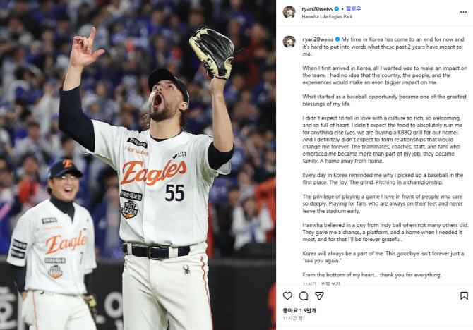 [이데일리 스타in 이석무 기자] 올해 KBO리그에서 한화이글스의 에이스로 활약한 라이언 와이스(29)가 한국 팬들에게 특별한 작별 인사를 전했다. 올 시즌 코디 폰세와 함께 한화