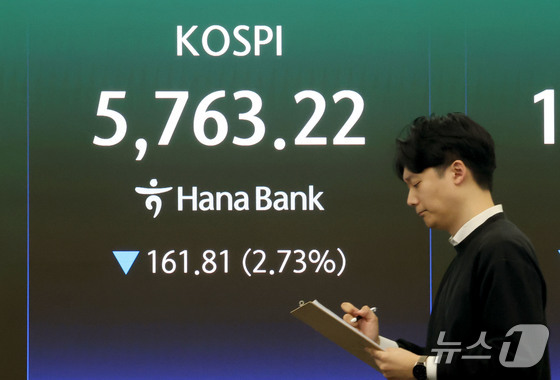 코스피 지수가 외국인의 매도세에 하락 마감한 19일 오후 서울 중구 하나은행 딜링룸 현황판에 전장대비 161.81포인트2.73% 하락한 5,763.22…