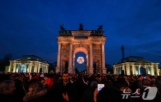 7일현지시간 오후 이탈리아 밀라노 '평화의 아치'아르코 델라 파체·Arco della Pace 성화대에 점화된 성화가 불타고 있다. …