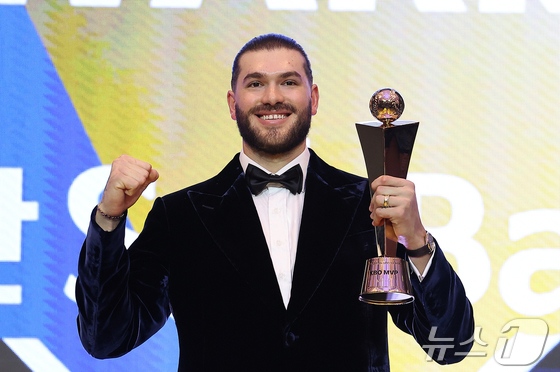 24일 오후 서울 송파구 잠실 롯데월드 호텔에서 열린 프로야구 '2025 신한 SOL 뱅크 KBO리그' 시상식에서 MVP를 수상한 한화 외국인 투수 폰세가 기념 촬영을 …