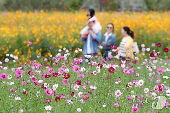개천절인 3일 오후 징검다리 연휴를 맞아 경북 경산시 하양읍 대부잠수교 인근 코스모스단지를 찾은 시민들이 곱게 핀 코스모스 사이를 걸으며 완연한 가을을 만끽하고 있다. …