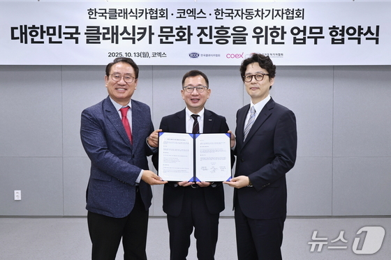 일 서울 코엑스에서 열린 '대한민국 클래식카 문화 진흥을 위한 업무 협약식'에서 정재신 한국클래식카협회장왼쪽부터, 조상현 코엑스 대표, 최대열 한국…