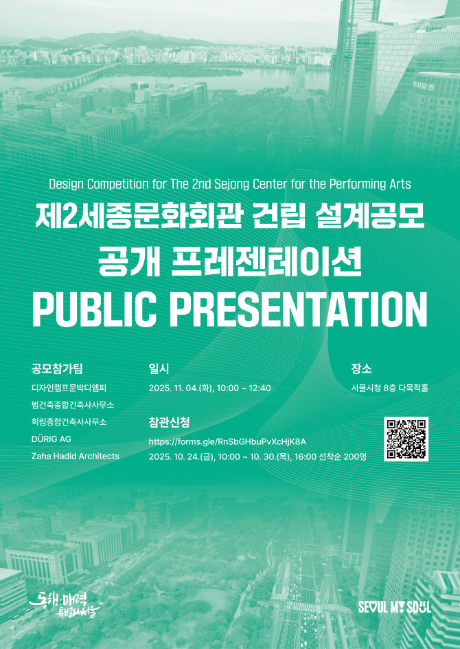 [이데일리 김형환 기자] 여의도공원 내 한강과 맞닿은 입지에 조성되는 제2세종문화회관에 대한 설계 공모를 서울 시민과 함께 심사한다. 제2세종문화회관 공개 프레젠테이션 안내 포스터
