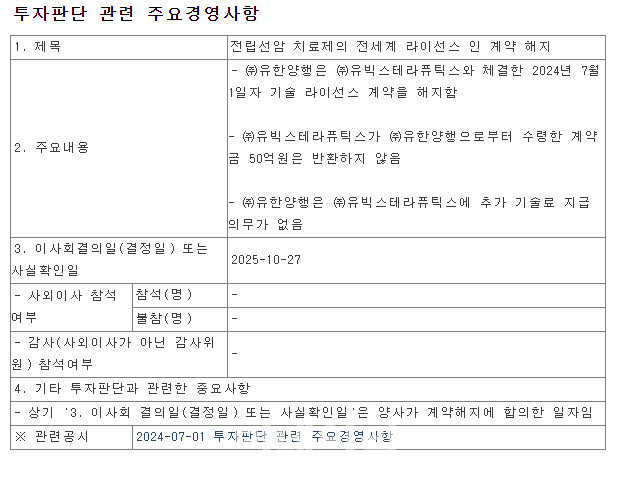 [이데일리 김지완 기자] 유한양행(000100)은 유빅스테라퓨틱스와 체결한 기술 라이선스 계약을 해지했다고 27일 공시했다. (제공=금융감독원) 앞서 유빅스테라퓨틱스는 지난해 7월