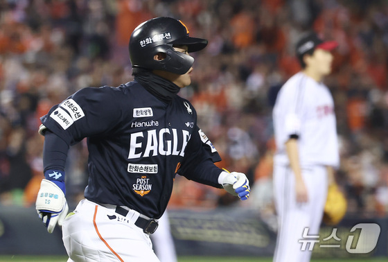 일 서울 잠실야구장에서 열린 프로야구 신한 SOL뱅크 KBO 포스트시즌 한국시리즈 차전 한화 이글스와 LG 트윈스의 경기, 한화 문현빈이 회초 사 루…