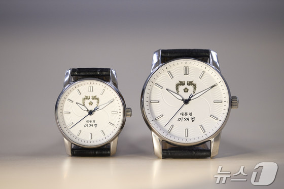 대통령실은 5일 서울 용산 대통령실 청사에서 강유정 대변인 브리핑을 통해 이재명 대통령 기념 손목시계를 공개했다. 사진은 왼쪽은 여성용, 오른쪽은 남성용 이 대통령 기념…