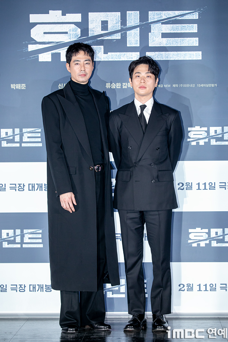 배우 조인성, 박정민이 12일 오전 서울 광진구 롯데시네마 건대입구점에서 열린 영화 ‘휴민트’ 제작보고회에 참석해 포즈를 취하고 있다. ‘휴민트’는 비밀도, 진실도 차가운 얼음 바