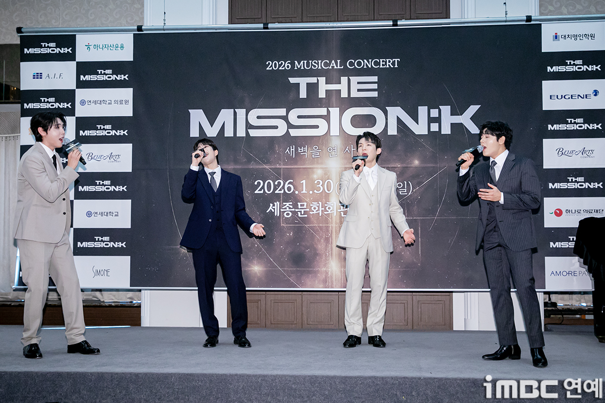 재윤, MJ, 리키, 김동준이 5일 오전 서울 중구 프레스센터에서 열린 뮤지컬 콘서트 ‘더 미션:K’ 기자간담회에 참석해 시연을 하고 있다. ‘더 미션:K’는 조선에 도착한 네 명