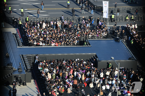방탄소년단BTS 컴백 공연일인 21일 오후 서울 종로구 광화문광장 무대 관객석으로 팬들이 입장을 하고 있다. 2026.3.21 뉴스1 임세…