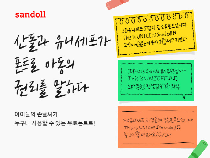 [이데일리 김세연 기자] 콘텐츠 크리에이터 플랫폼 기업 산돌(419120)은 세계 어린이날(11월 20일)을 맞아 유니세프 한국위원회와 함께 ‘유니세프 어린이 손 글씨 폰트’ 3종
